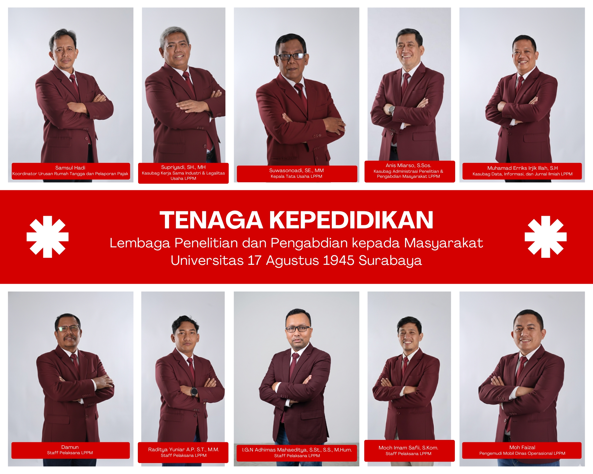 Lembaga Penelitian dan Pengabdian kepada Masyarakat (LPPM) Universitas 17 Agustus 1945 Surabaya merupakan unit pelaksana akademik yang bertugas mengoordinasikan, memfasilitasi, mengembangkan, dan mengelola kegiatan penelitian serta pengabdian kepada masyarakat.
